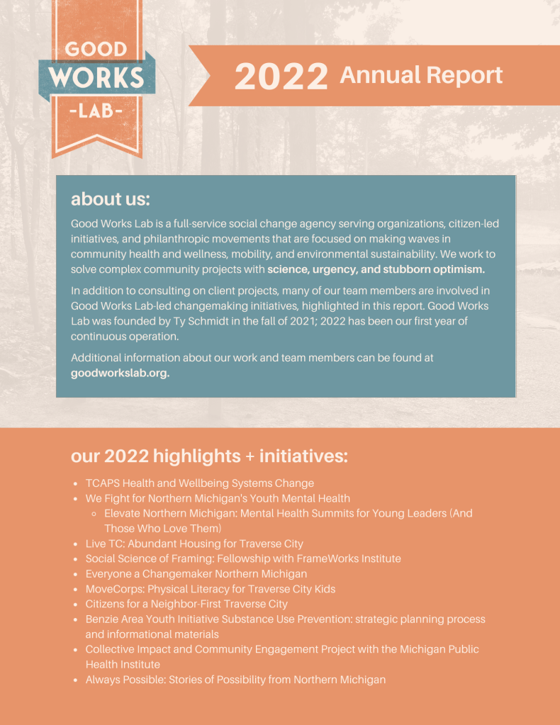 - Facilitating a strategic planning process and analyzing The Michigan Profile for Healthy Youth (MiPHY) data and create graphics/infographics with Grow Benzie and the Benzie Area Youth Initiative